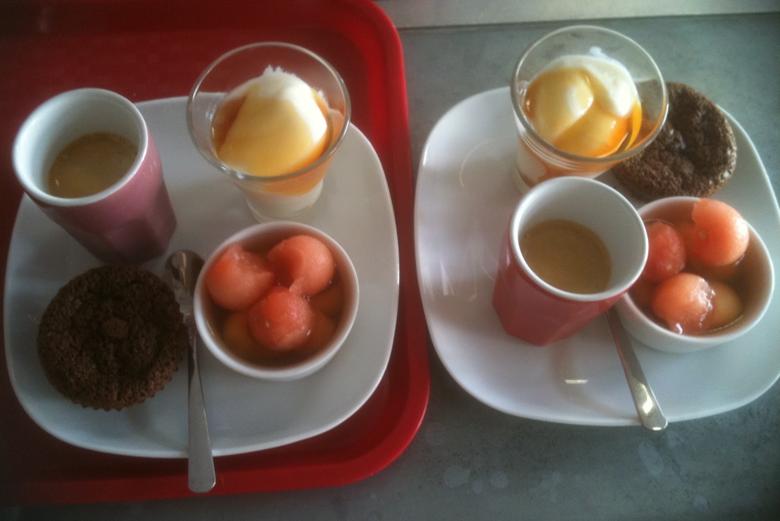 Moelleux au chocolat, billes de melon et pastèques au sirop de basilic, et enfin gwell au sirop de pomme !!! tout frais tout bon tout bio
